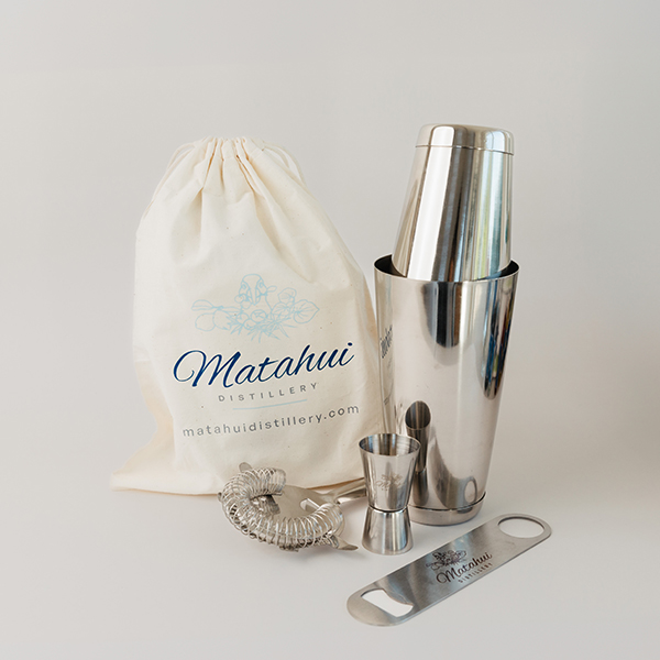 Complete professional cocktail kit for serious home bartenders. Includes Boston shaker, bar strainer, Matahui bottle opener, bar jigger (15/30ml or 25/50ml options), all in branded bag. Everything needed for cocktail perfection.